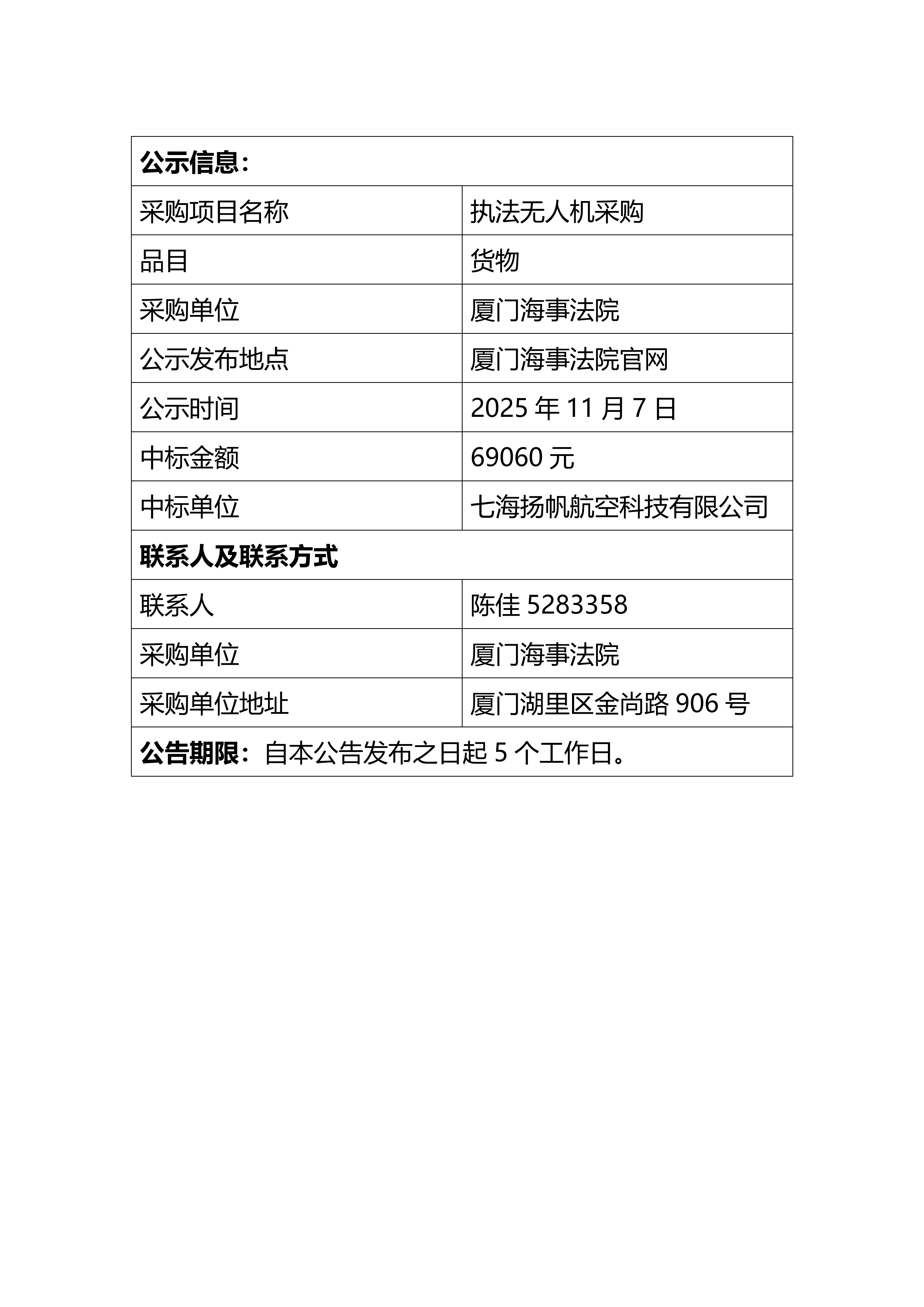厦门海事法院执法无人机采购结果公告
