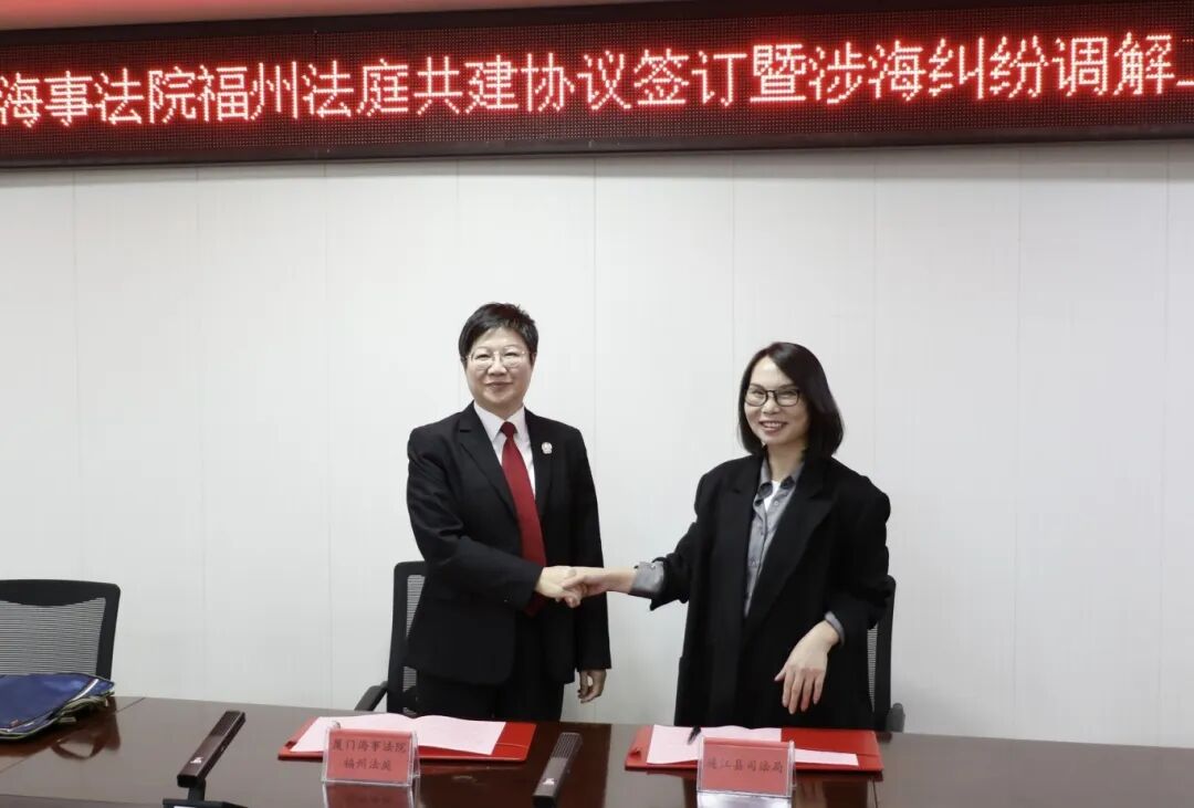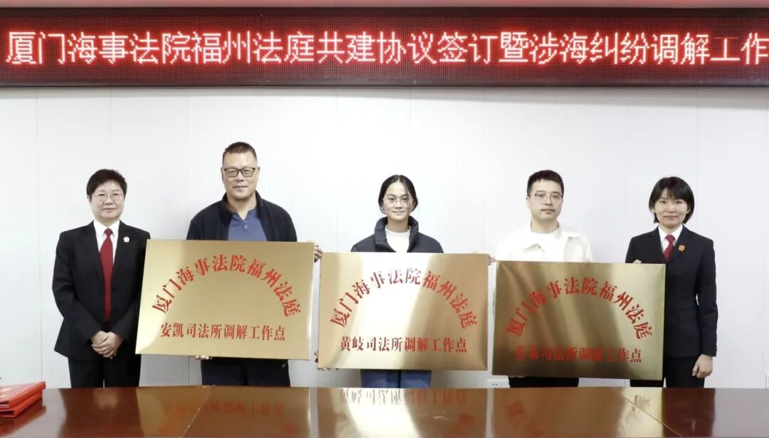 11月19日,厦门海事法院福州法庭与连江县司法局在连江县苔箓镇签署共建合作协议,并为首批设立在苔菉、黄岐、安凯司法所的“厦门海事法院福州法庭调解工作点”授牌。该批海上“解纷站”的设立,延伸了海事司法服务半径,打通涉海司法服务的“最后一公里”,实现海事解纷资源下沉、端口前移。